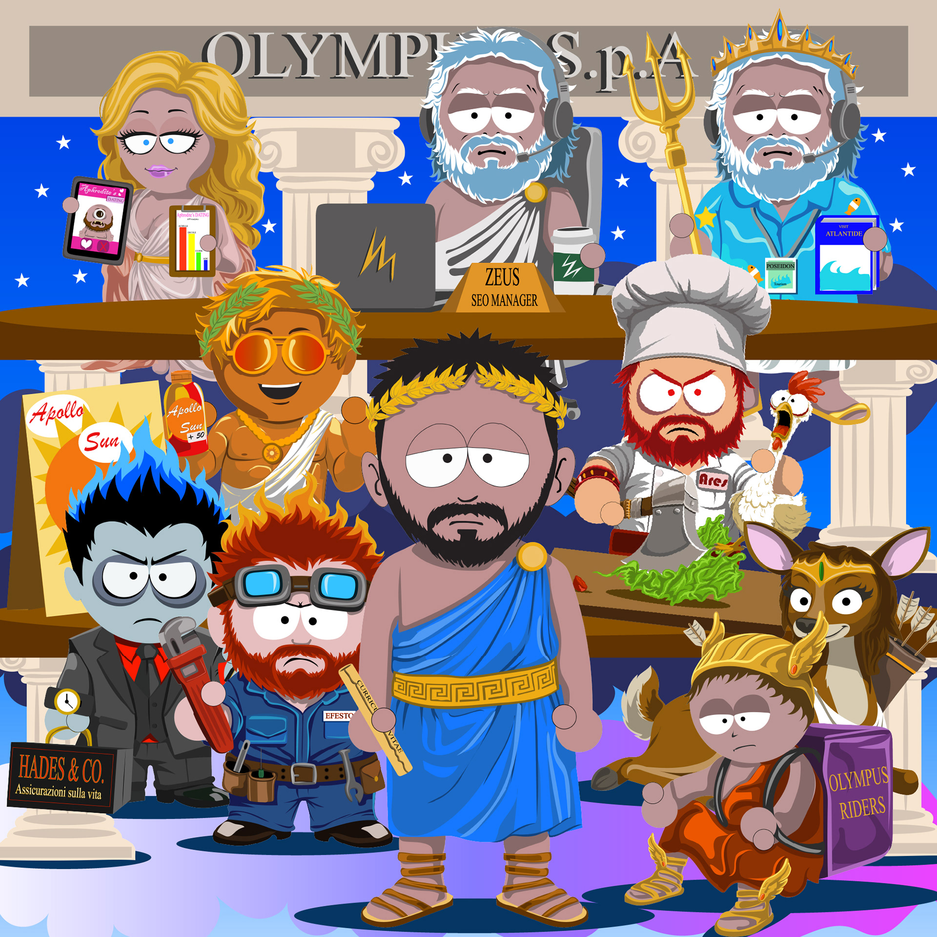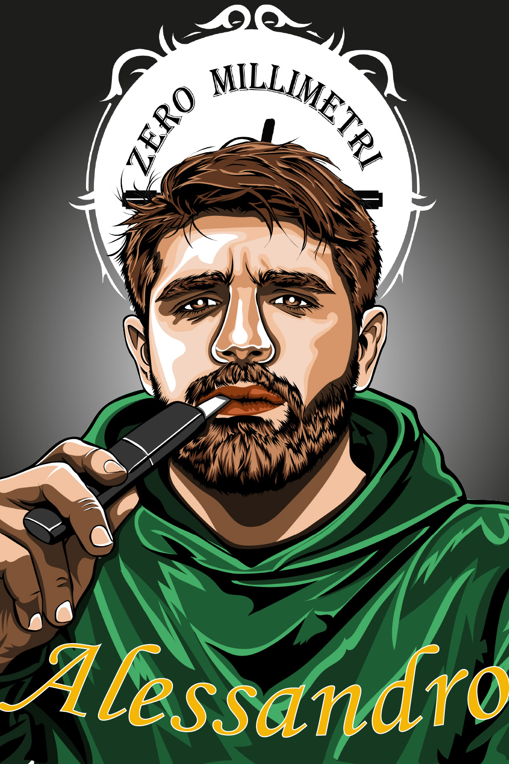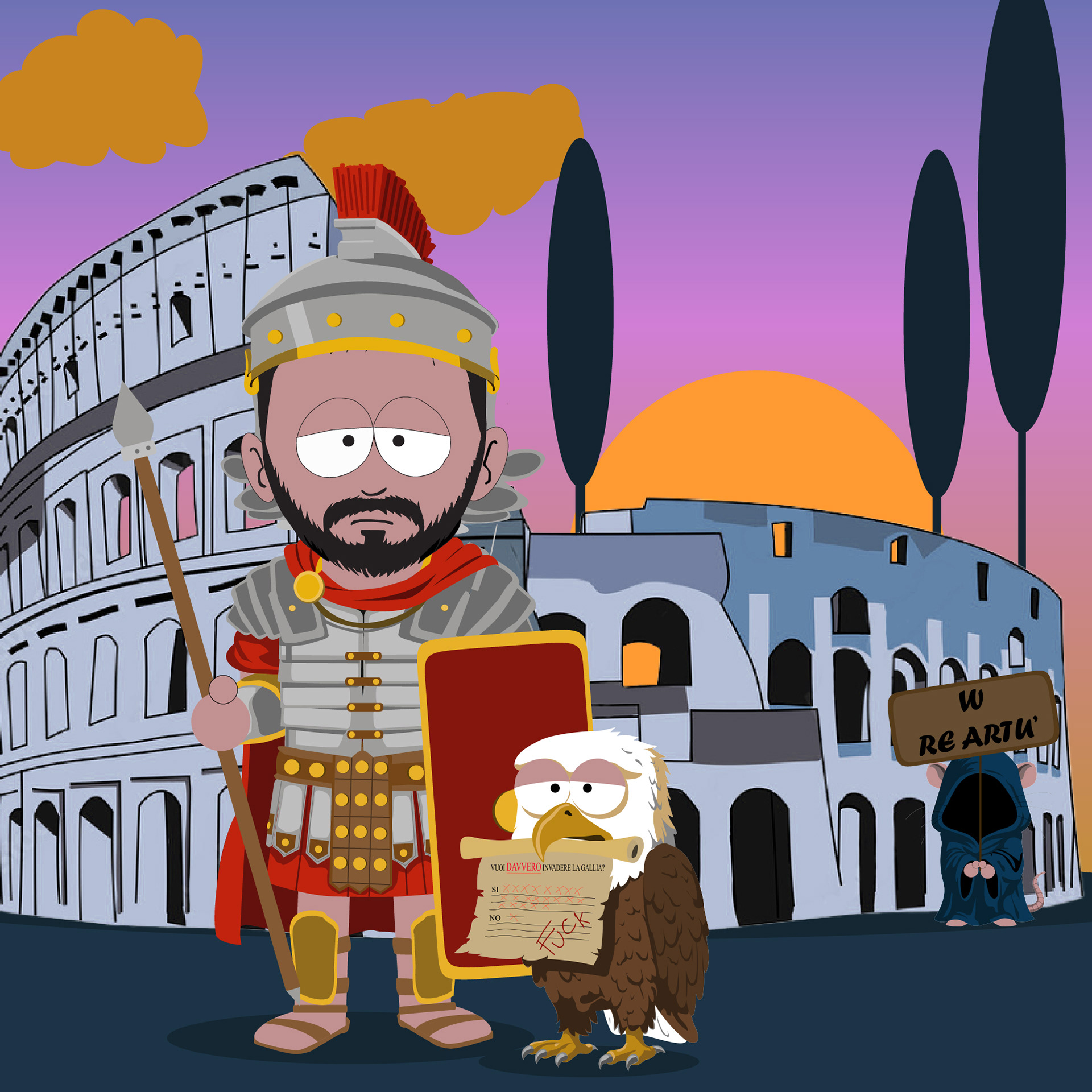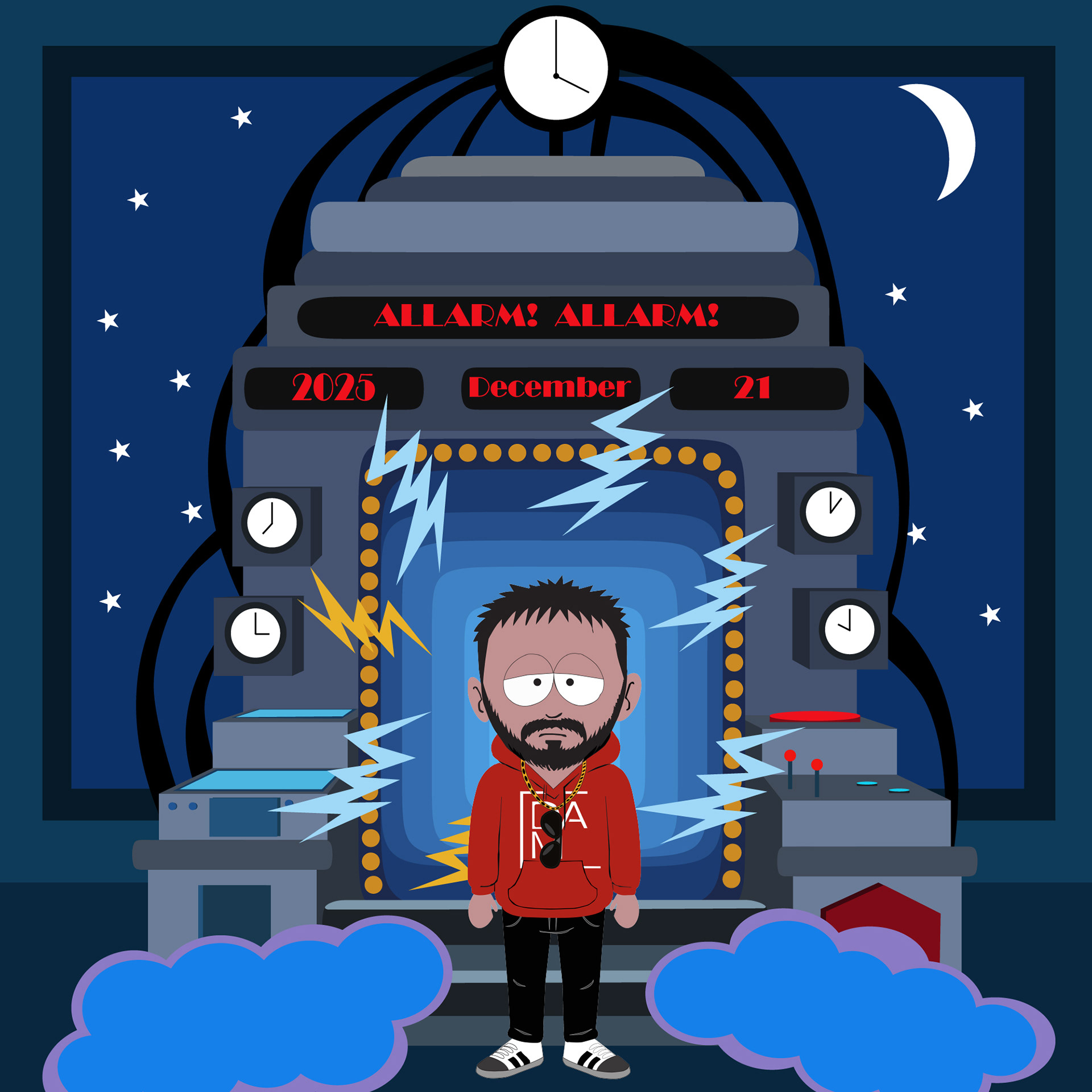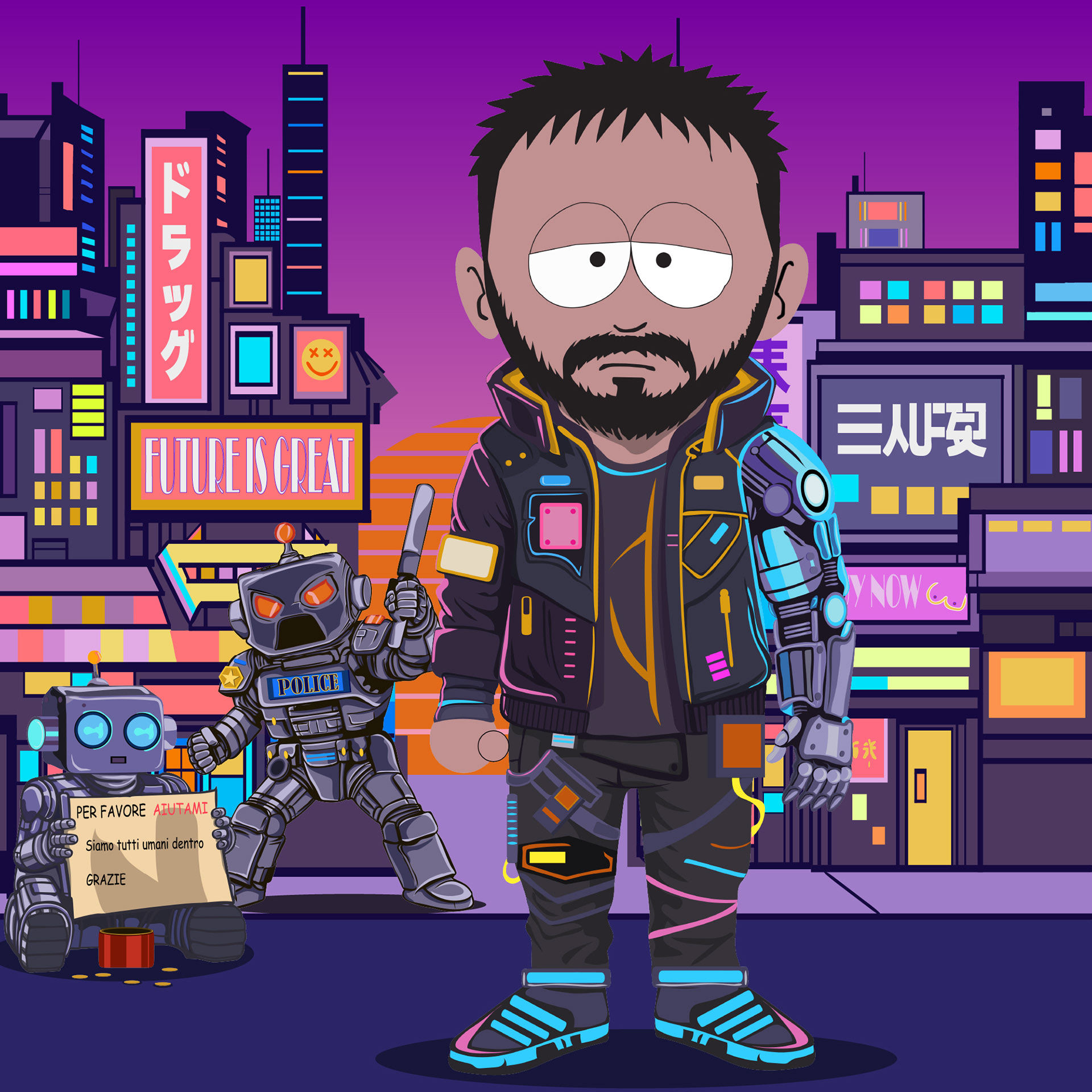 A custom illustrated portrait developed in a South Park–inspired style, combined with a narrative carousel designed for social media.